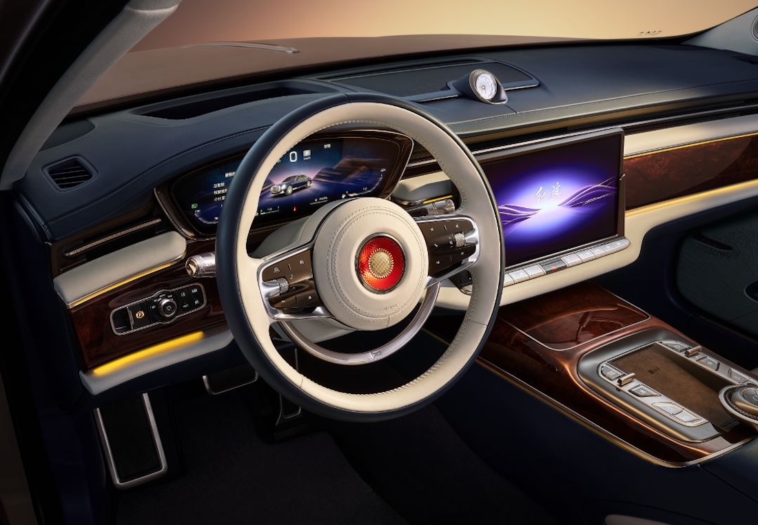 Узнаваемая продольная красная линия на капоте дополнена поднимающимся и убирающимся хромированным «крылом», выдвигающимся в момент старта автомобиля. Передние фары выполнены в форме, где округлый верх (небо) и строгий низ (земля) воплощают древнюю концепцию гармонии мироздания. Задние фары, напротив, стилизованы под аутентичные китайские дворцовые фонари.