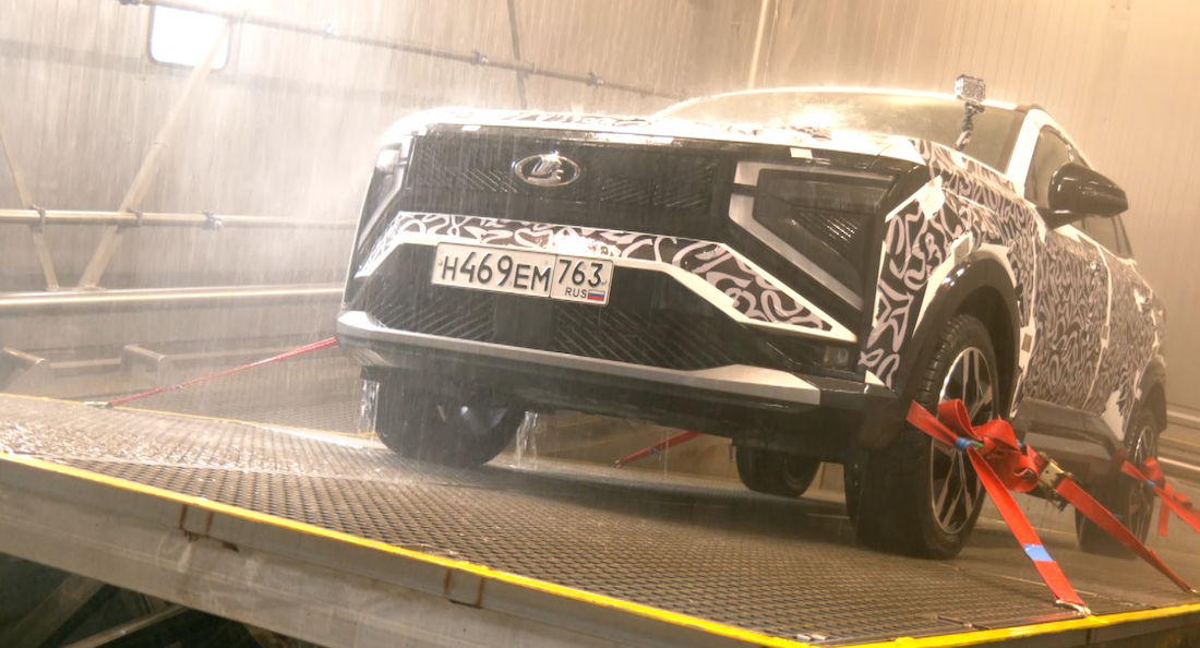 Испытания LADA Azimut проводились и в новой дождевальной камере. Здесь имитируются все виды дождя, кроме того, автомобиль наклоняется на специальной платформе.