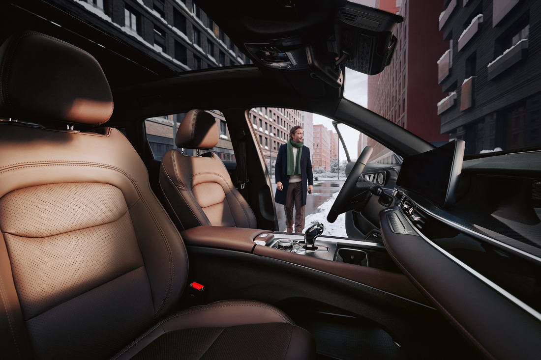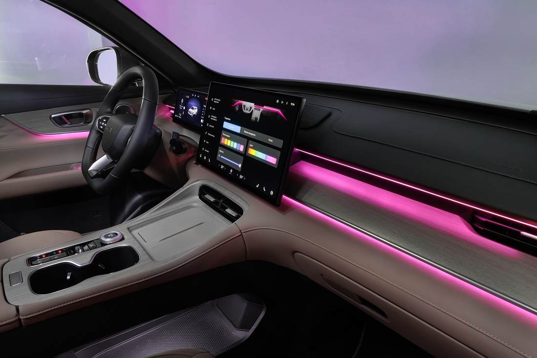 Центральная консоль выполнена в минималистичном стиле. Физические кнопки и контроллер выбора режима движения позволяют быстро и легко управлять функциями автомобиля. Для смартфона предусмотрена беспроводная зарядка, а также три USB-порта для подключения и зарядки устройств. Фирменная LED-подсветка по контуру салона доступна в нескольких цветовых режимах. У сидений водителя и переднего пассажира тщательнейшим образом продумана эргономика: боковая поддержка умеренная, наполнитель – не жесткий, а эстетика интерьера заметно приближена к премиальным «одноклассникам». Диван с откидным подлокотником не менее удобен.