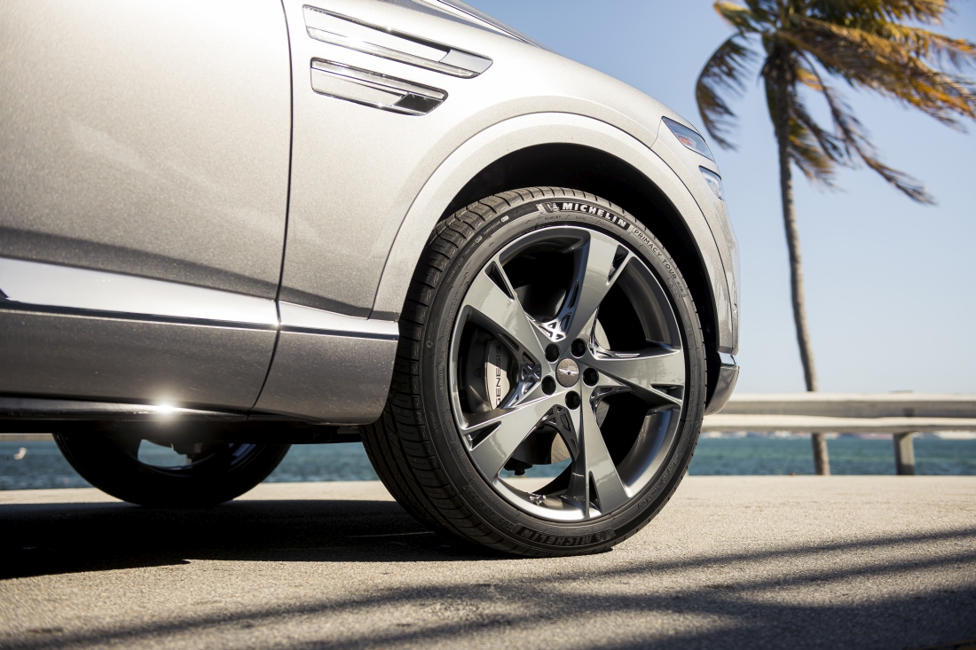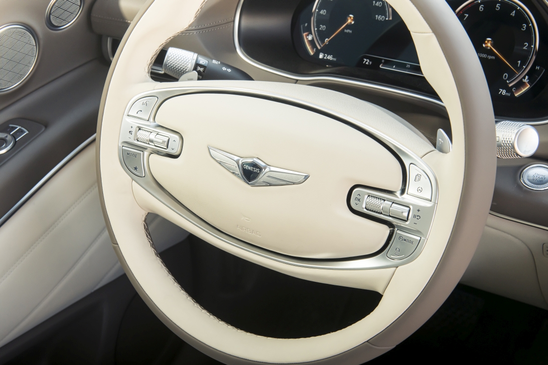 Первый кроссовер Genesis, разумеется, получил набор современных электронных ассистентов. В их числе опция активного круиз-контроля с системами автоматического торможения и уклонения от встречного транспорта. Из-под лобового стекла на дорогу смотрят несколько видеокамер. Одна из них сканирует качество дороги. Перед ямой или «лежачим полицейским» компьютер дает команду электронно-управляемым амортизаторам подготовиться и оптимально отработать неровность. Такая система обеспечивает высокий уровень комфорта, что позволило марке Genesis отказаться от пневмоподвесок. И это может стать важным аргументом при сравнении с конкурентами. Особенно для тех, кто видел старые премиум-внедорожники с неисправными пневмобаллонами, грустно «присевшие на колеса» и брошенные на парковках.
