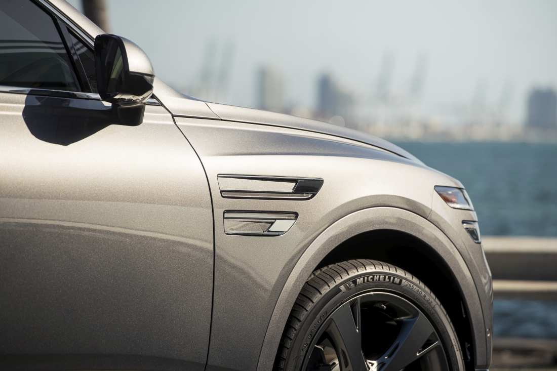 С первой задачей новый премиум-внедорожник справился: смотрится он дорого и привлекательно. У Genesis GV80 благородный силуэт и классические пропорции. Длинный капот свидетельствует о продольном расположении многолитрового двигателя. Фары, фонари и даже поворотники на передних крыльях сделаны двухуровневыми. Рельефные боковины проходят по всей длине кузова, завершаясь горизонтальным выступом на багажной двери. Мощности образу добавляют колесные диски размером от 19 до 22 дюймов!