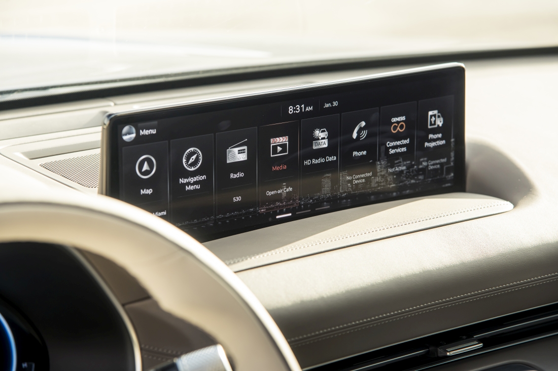Корейская марка отказалась от каких-либо заимствований, интерьер GV80 полностью оригинален и по-хорошему лаконичен. Архитектура передней панели построена по горизонтали: от края до края тянется узкая линия воздуховодов, вытянут вширь 14,5-дюймовый (около 37 см!) экран мультимедийной системы