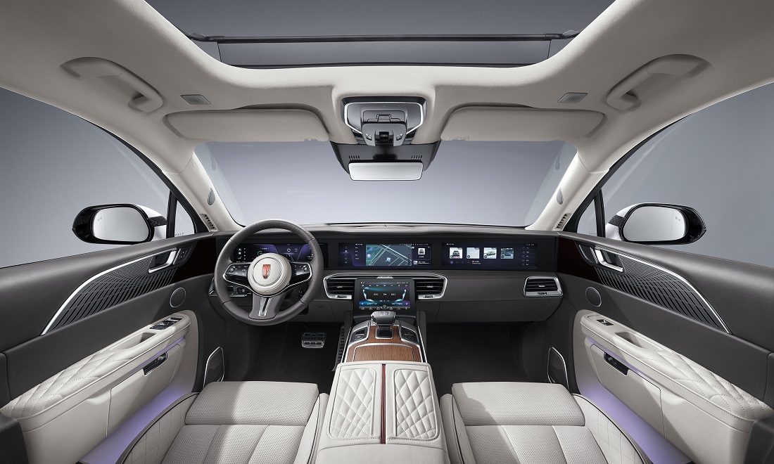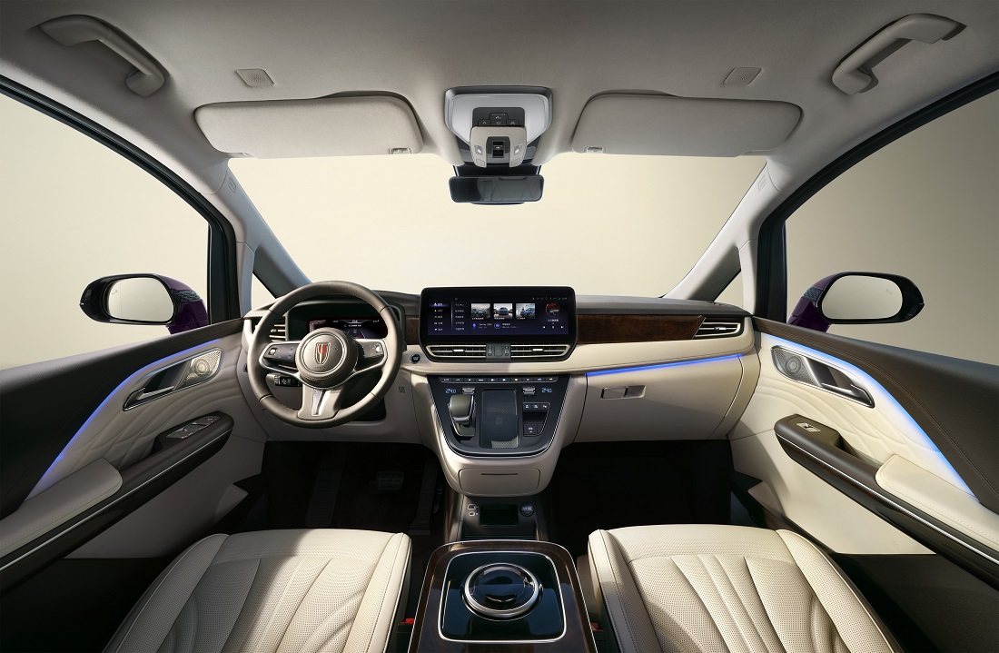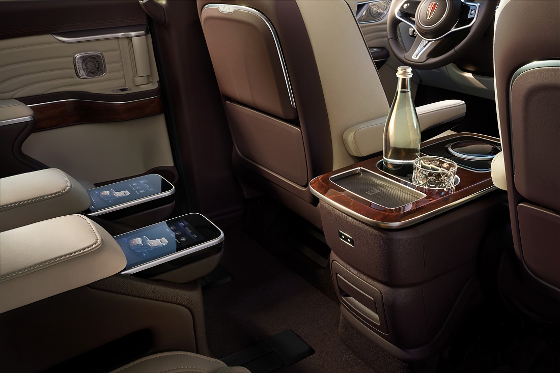 Салон, рассчитанный на семерых, отличает шикарная отделка. На втором ряду установлены два капитанских кресла с электроприводом, подогревом, вентиляцией, массажером и откидными подставками для ног. Управление основными функциями сосредоточено в сенсорных экранах, встроенных в подлокотники. На спинках передних сидений закреплены откидные столики. Третий ряд рассчитан на троих. HONGQI HQ9 базируется на переднеприводной платформе, под капотом располагается 2-литровая «турбочетверка» (245 л. с.), коробка передач — 8-диапазонный «автомат». Минивэн снаряженной массой 2465 кг может набрать первую «сотню» за 9,5 с, максимальная скорость — 200 км/ч.