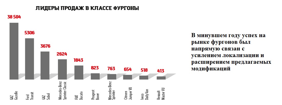 В итоге обрусевшему «американцу» удалось сместить с почетной второй позиции Mercedes-Benz Sprinter Classic, также имеющий российскую «прописку»: с 2013 года этот популярный фургон (представляющий собой Sprinter прошлого поколения) выпускают на мощностях «Группы ГАЗ» в Нижнем Новгороде. «Немец» откатился на четвертое место с 2624 проданными автомобилями (–1944 единицы), а на пятом расположился Fiat Ducato (1843 машины), который сегодня поставляют с итальянского завода Sevel.