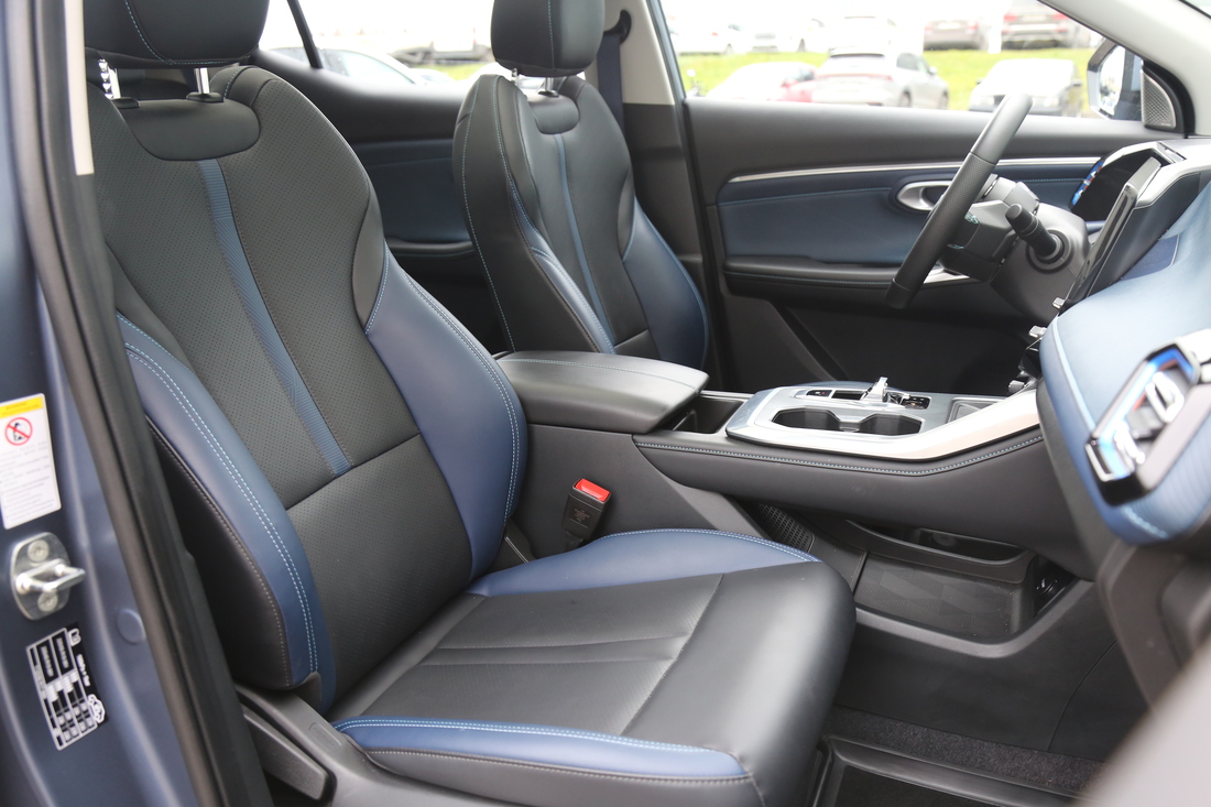 Салон подкупает спортивным антуражем и выверенной эргономикой. Водительское кресло, обшитое двухцветной экокожей, считай, эталонное по удобству электронастроек, длине подушки, мягкости наполнителя и элементам поддержки. Руль настраивается в двух плоскостях на большом плече. А вот пассажирское кресло имеет лишь механические регулировки и лишено настройки по высоте. Центральный бокс-подлокотник глубок, мягок и широк, есть много розеток для подключения гаджетов, беспроводная зарядка и уйма вещевых ниш.
