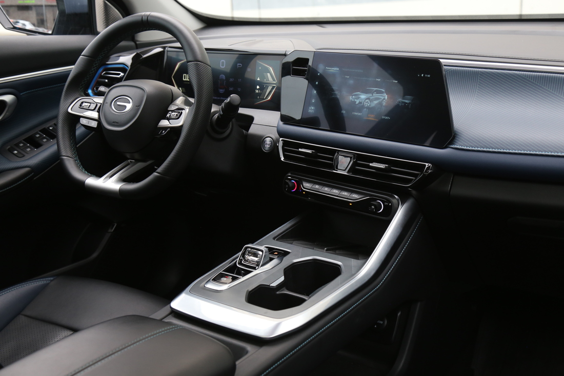 Однако действенный, пусть и не универсальный инструмент «обуздания» GAC GS3 все же есть. Он заключен в микроскопическом селекторе трансмиссии на центральном тоннеле. Ткнув в меню 10,25-дюймового экрана на пиктограмму, например, режима Comfort, можно молниеносно переключаться из «Комфорта» в «Спорт» простым качанием селектора на себя. Выберешь «Спорт», и окажешься в регистре «Спорт»-«Спорт+», нажмешь на Eco, и будешь тасовать предустановки «Эко» и «Комфорт». Иным словами, каждый может задать для себя горячую пару установок, и поскольку селектор ухватистый и лежит точно под рукой, менять режимы получается очень оперативно.