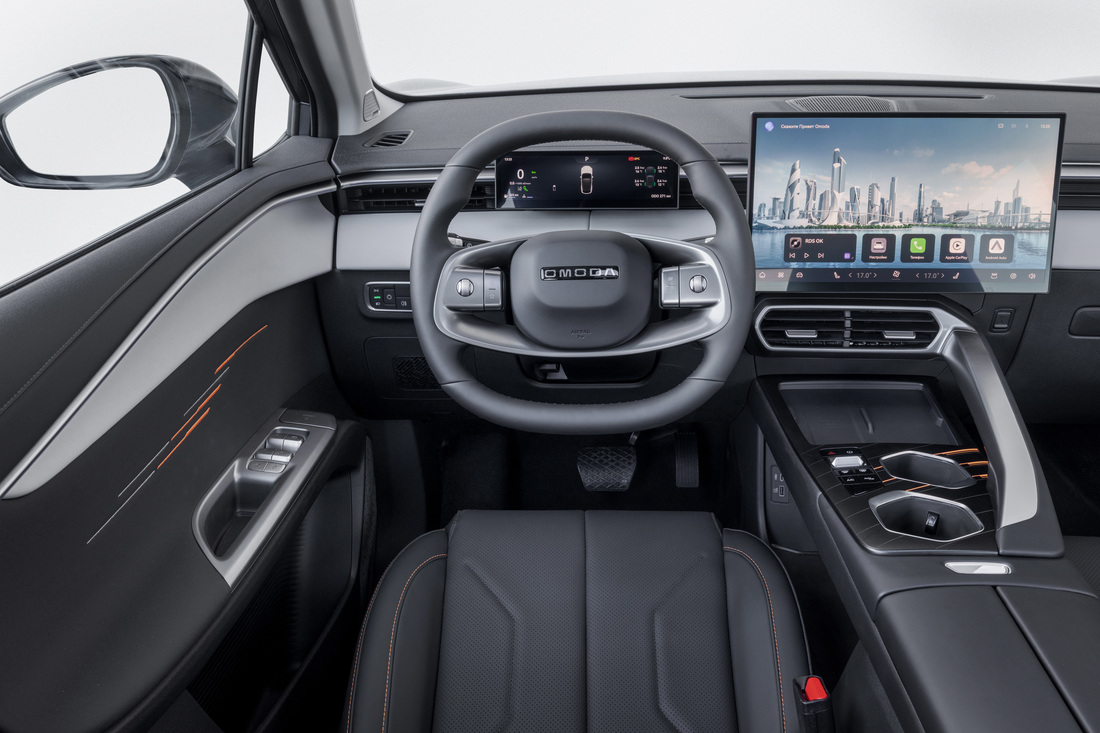 На первом ряду салона произошли значительные изменения, призванные повысить одновременно комфорт и эргономику. Пожалуй, главное конструктивное новшество — переезд селектора трансмиссии с центрального тоннеля под правую спицу руля. Это решение, присутствующее и в новом Jaecoo J6, разгрузило площадку между двумя передними сиденьями. В освободившемся пространстве разместились два отсека с беспроводной зарядкой для смартфонов и пара глубоких подстаканников.