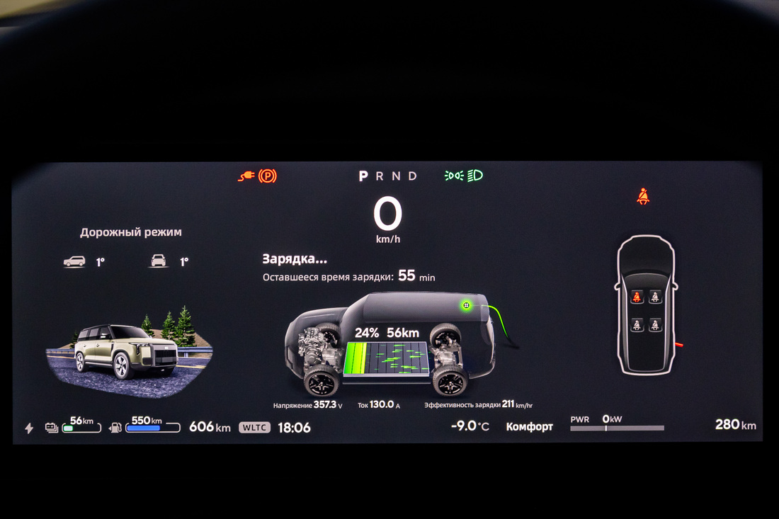 Аккумулятор, кстати, установлен под полом салона, его можно зарядить от терминала переменного или постоянного тока: исполнения Rox 01 для России имеют китайские разъемы GB/T. Бак при этом у Rox 01 немаленький — на 70 л. Когда он полностью заправлен, а батарея заряжена, можно рассчитывать на преодоление 1 115 км. Расход бензина в гибридном режиме при этом не самый скромный — по факту порядка 11–12 л в черте города. Сказывается в том числе и достаточно серьезная снаряженная масса трехрядного гибрида — 2 580 кг.